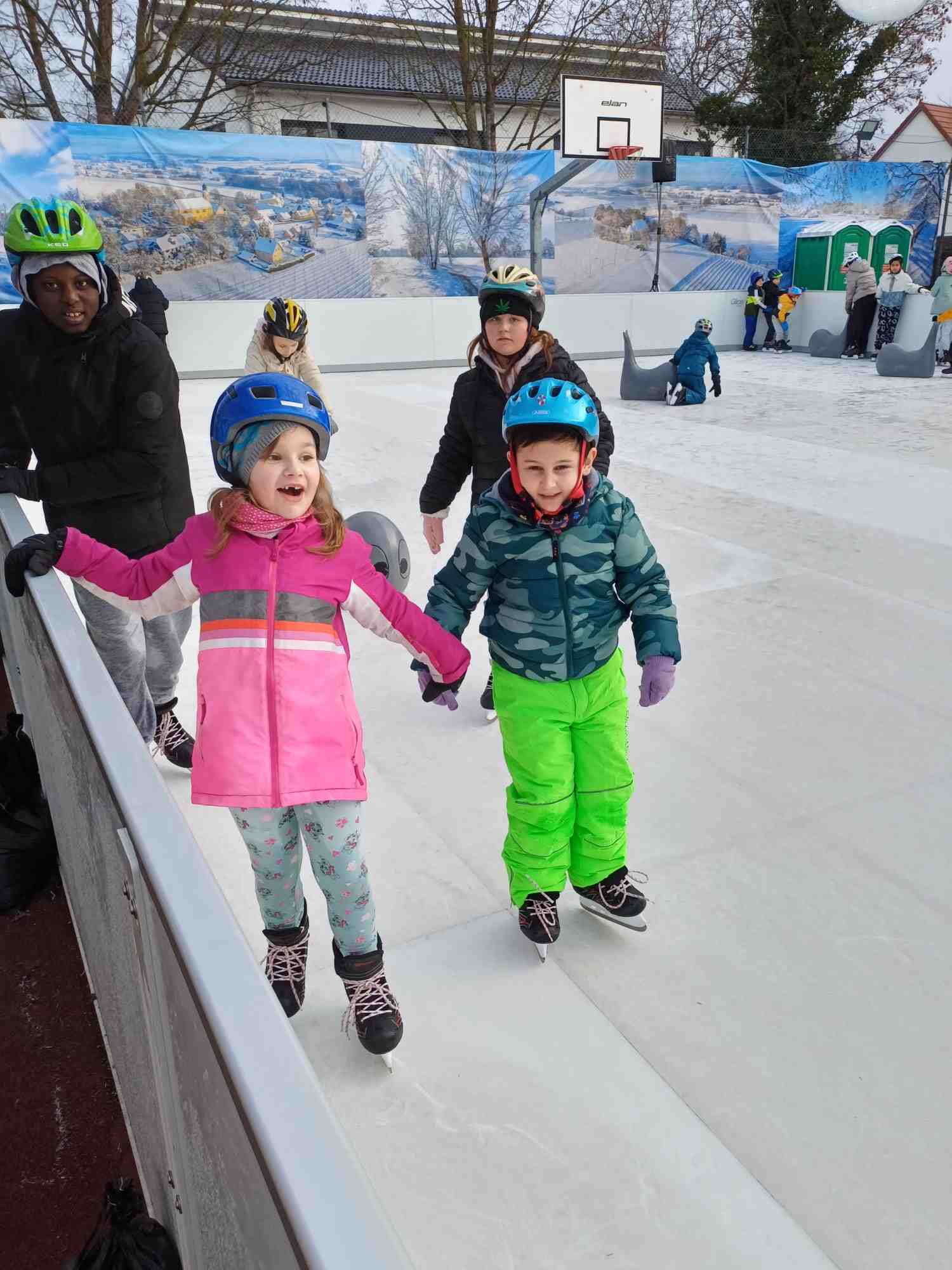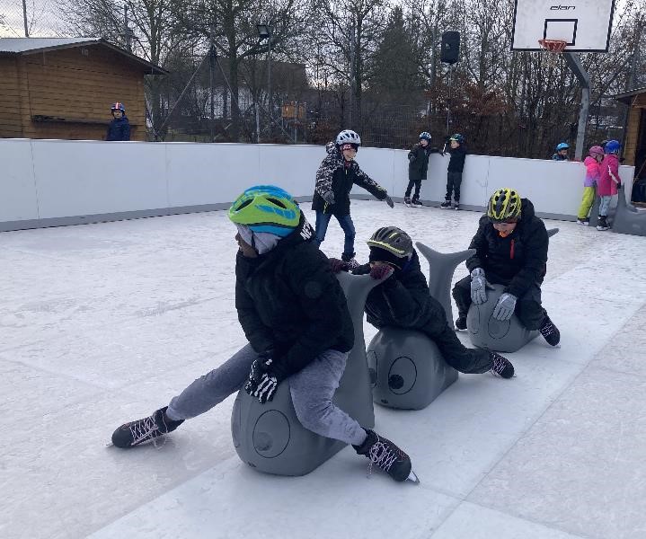 Kaum dort angekommen, schnürten die Schülerinnen und Schüler die Schlittschuhe, die sie sich vor Ort kostenlos ausleihen konnten, an. Einige mutige Kinder drehten sogleich ihre ersten Runden über die Kunsteisbahn oder fuhren einbeinig über die Eisfläche. Andere beobachteten zunächst das bunte Treiben vom Seitenrand aus oder nutzten die freundlichen Wale zur Eingewöhnung.