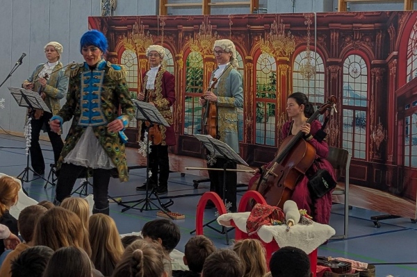 Das Konzert war eine interaktive musikalische Reise, die sowohl Schülerinnen und Schüler als auch das Kollegium in die stimmungsvolle Welt des Winters entführte. Mit dem Klang von Pferdeglocken und Peitschenknallen schuf das Ensemble eine lebendige Atmosphäre, in der die Kinder aktiv mitmachten: Sie ahmten die gehörten Klänge nach und tauchten so tief in die Märchenwelt einer Schlittenfahrt ein.
