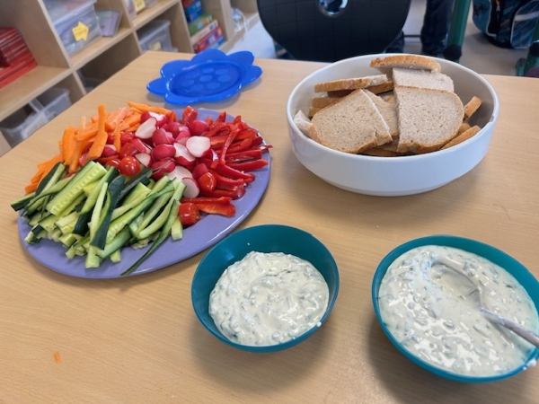 Im Anschluss wurde gemeinsam geschnippelt, gerührt und probiert: Aus frischem Gemüse und Kräutern entstand ein leckerer Kräuterquark mit bunter Gemüseplatte – gesund und köstlich zugleich!