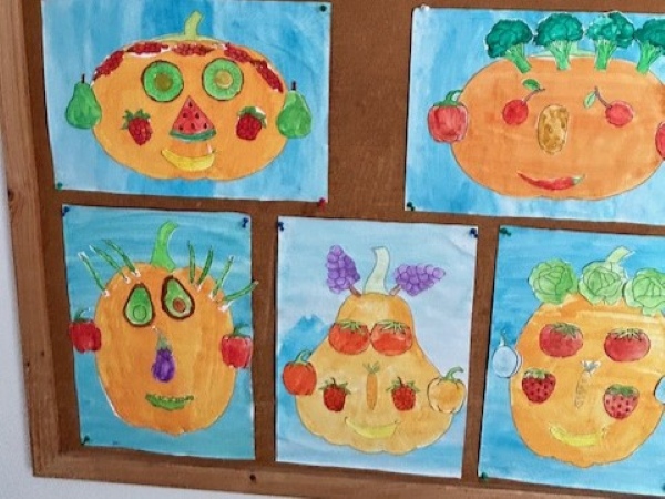 Auch im Kunstunterricht drehte sich alles um Obst und Gemüse. Inspiriert vom Künstler Giuseppe Arcimboldo gestalteten die Kinder fantasievolle Obst- und Gemüseköpfe, die echte Hingucker geworden sind.